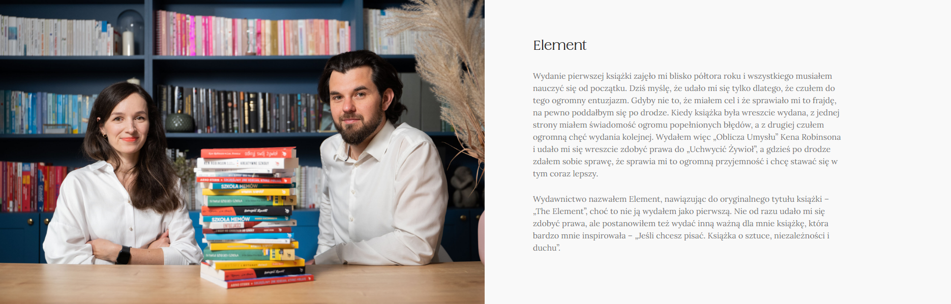 Wydawnictwo Element to rodzinna firma. Założyliśmy ją, żeby wydać książki, które nas zainspirowały i nam pomogły – najpierw jako młodym ludziom, którzy szukali swojej drogi, a potem jako młodym rodzicom. Jeśli chcielibyście dowiedzieć się o nas czegoś więcej, zapraszamy do przeczytania poniższego tekstu.